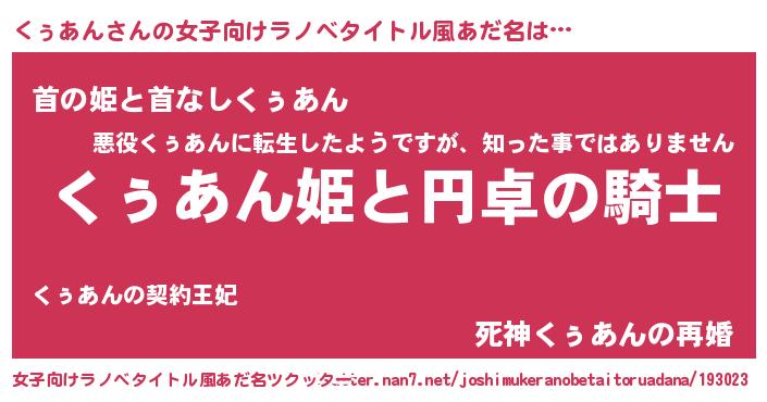 | 男性向けラノベタイトル風あだ名 | 『クゥアンアートオンライン』 |