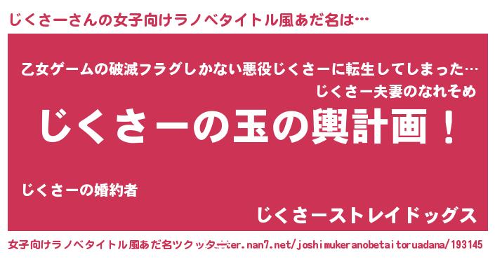 | 男性向けラノベタイトル風あだ名 | 『じくさー~年齢イコール彼女いない歴の魔法使い~』 |