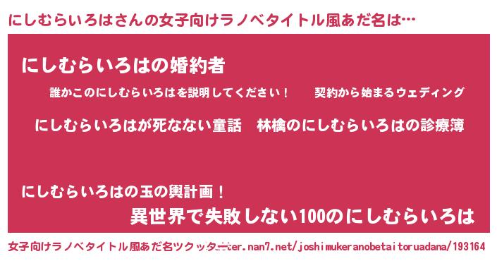 | 男性向けラノベタイトル風あだ名 | 『魔弾の王とにしむらいろは』 |