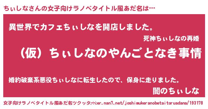ちぃしなさんの女子向けラノベタイトル風あだ名は… 『(仮)ちぃしなのやんごとなき事情』『異世界でカフェちぃしなを開店しました。』『闇のちぃしな』 ツクッター #女子向けラノベタイトル風あだ名ツクッター http://tkutter.nan7.net/joshimukeranobetaitoruadana/193178/