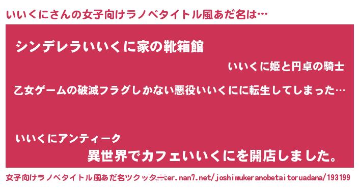 | 男性向けラノベタイトル風あだ名 | 『この素晴らしい世界にいいくにを!』 |