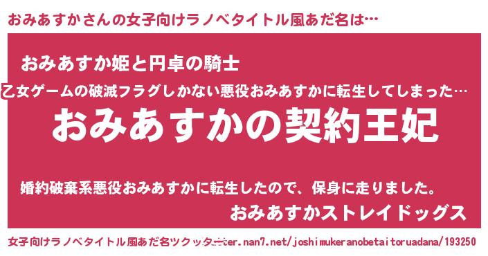 | 男性向けラノベタイトル風あだ名 | 『おみあすかという概念が存在しない退屈な世界 』 |