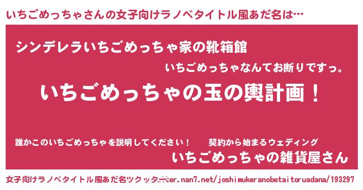 いちごめっちゃさんの女子向けラノベタイトル風あだ名は… 『いちごめっちゃの玉の輿計画!』『シンデレラいちごめっちゃ家の靴箱館』『いちごめっちゃの雑貨屋さん』 ツクッター #女子向けラノベタイトル風あだ名ツクッター http://tkutter.nan7.net/joshimukeranobetaitoruadana/193297/
