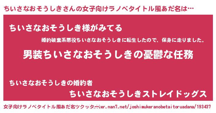 男性向けラノベタイトル風あだ名 | 『うちのちいさなおそうしきが世界を掌握している!』 |