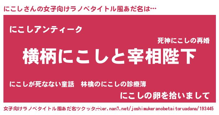 | 男性向けラノベタイトル風あだ名 | 『にこしに滅ぼされるだけの簡単なお仕事です』 |