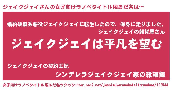 | 男性向けラノベタイトル風あだ名 | 『ダンジョンにジェイクジェイを求めるのは間違っているだろうか』 |