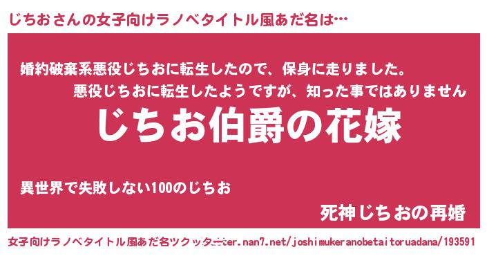| 男性向けラノベタイトル風あだ名 | 『うちの娘の為ならば、俺はもしかしたらじちおも倒せるかもしれない。』 |