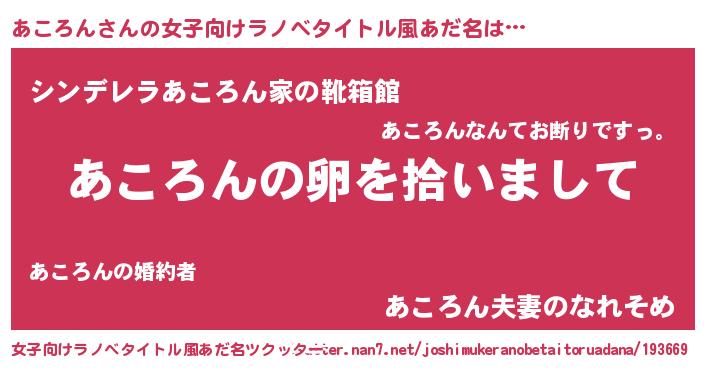 | 男性向けラノベタイトル風あだ名 | 『あころんの嫁は女の子じゃないと思った?』 |