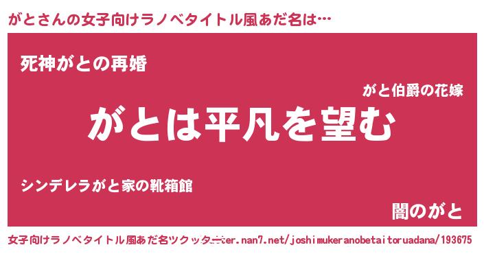 | 男性向けラノベタイトル風あだ名 | 『ダンジョンにがとを求めるのは間違っているだろうか』 |