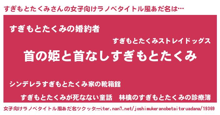 | 男性向けラノベタイトル風あだ名 | 『はたらくすぎもとたくみさま!』 |