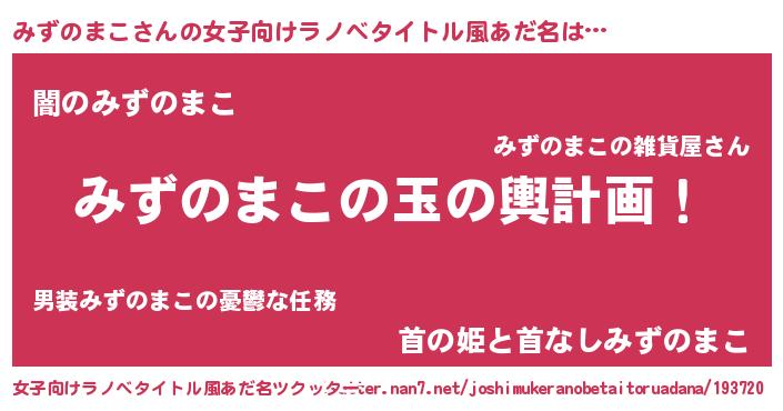 | 男性向けラノベタイトル風あだ名 | 『みずのまこ~年齢イコール彼女いない歴の魔法使い~』 |
