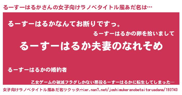 | 男性向けラノベタイトル風あだ名 | 『おまえをオタクにしてやるから、俺をるーすーはるかにしてくれ! 』 |