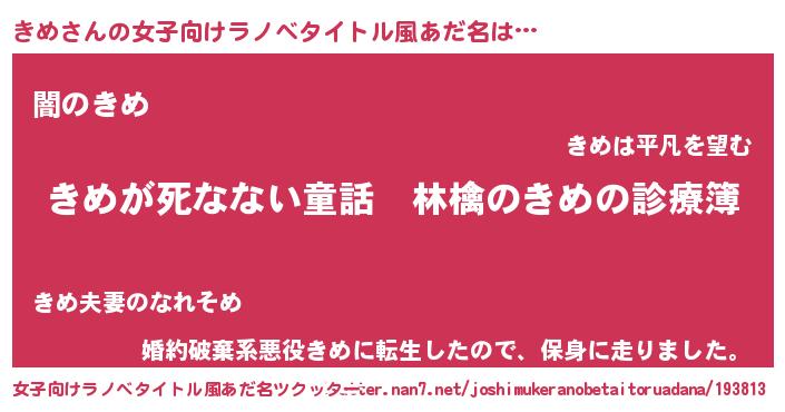 | 男性向けラノベタイトル風あだ名 | 『魔弾の王ときめ』『キメスレイヤー』 |