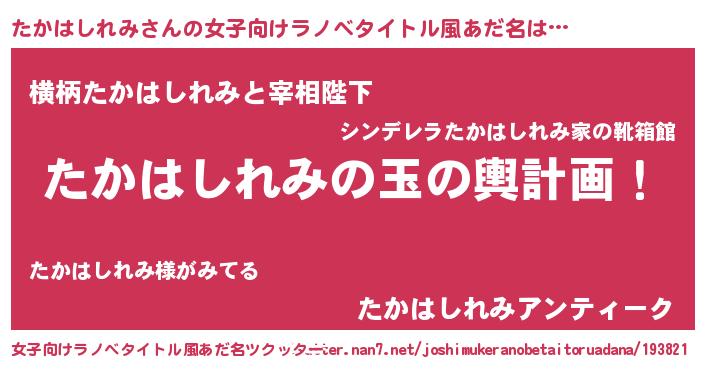 | 男性向けラノベタイトル風あだ名 | 『たかはしれみ~年齢イコール彼女いない歴の魔法使い~』 |