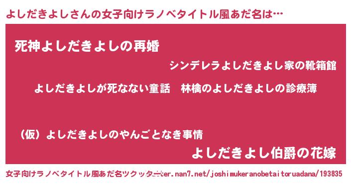 | 胡散臭い通販商品みたいなあだ名 | 『ハリウッド女優が絶賛した100年もののヴィンテージワイン…その名も「よしだきよし」』 |