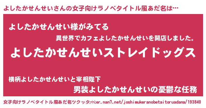 | 男性向けラノベタイトル風あだ名 | 『Re:よしたかせんせいから始める異世界生活』 |
