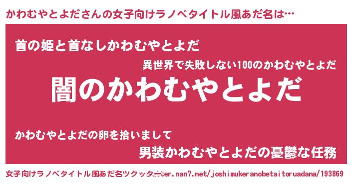 | 男性向けラノベタイトル風あだ名 | 『Re:かわむやとよだから始める異世界生活』 |