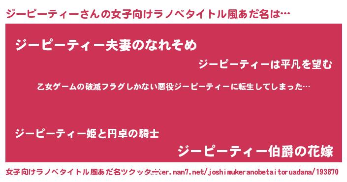 | 男性向けラノベタイトル風あだ名 | 『この素晴らしい世界にジーピーティーを!』 |
