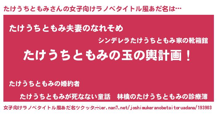 | 男性向けラノベタイトル風あだ名 | 『たけうちともみ~年齢イコール彼女いない歴の魔法使い~』 |