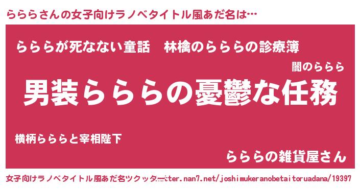 らららさんの女子向けラノベタイトル風あだ名は… 『男装らららの憂鬱な任務』『らららが死なない童話 林檎のらららの診療簿』『らららの雑貨屋さん』 ツクッター #女子向けラノベタイトル風あだ名ツクッター http://tkutter.nan7.net/joshimukeranobetaitoruadana/19397/