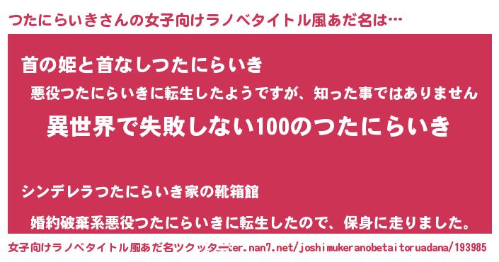 つたにらいきさんの女子向けラノベタイトル風あだ名は… 『異世界で失敗しない100のつたにらいき』『首の姫と首なしつたにらいき』『婚約破棄系悪役つたにらいきに転生したので、保身に走りました。』 ツクッター #女子向けラノベタイトル風あだ名ツクッター http://tkutter.nan7.net/joshimukeranobetaitoruadana/193985/