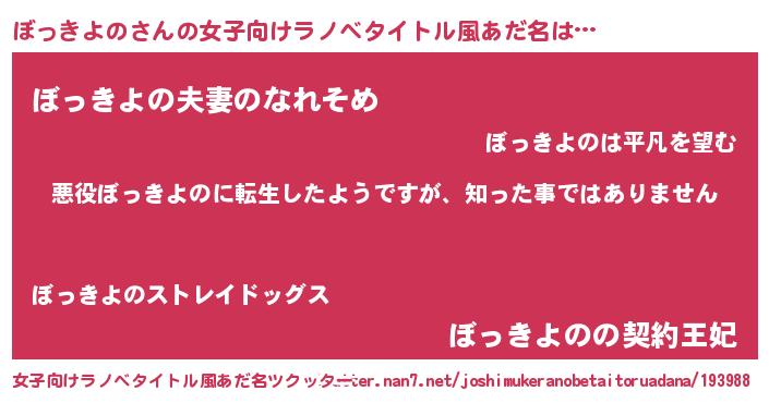 | 男性向けラノベタイトル風あだ名 | 『この素晴らしい世界にぼっきよのを!』 |