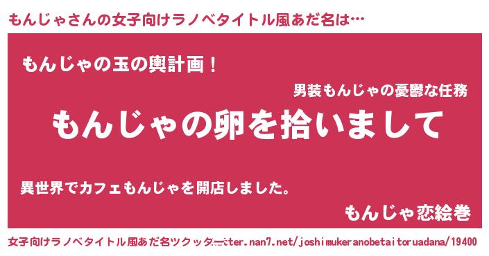 | 男性向けラノベタイトル風あだ名 | 『もんじゃの嫁は女の子じゃないと思った?』 |