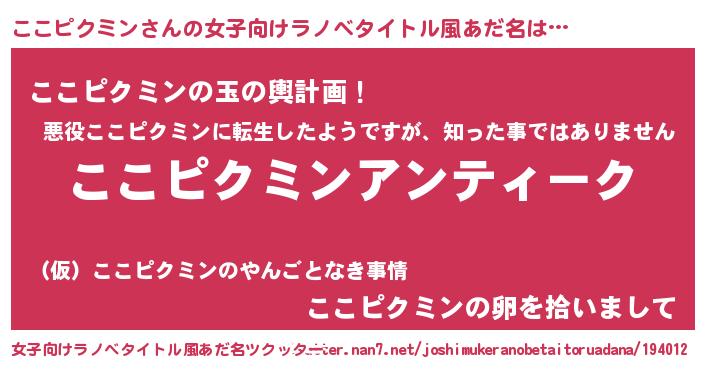 | 男性向けラノベタイトル風あだ名 | 『魔法科高校のここピクミン』 |