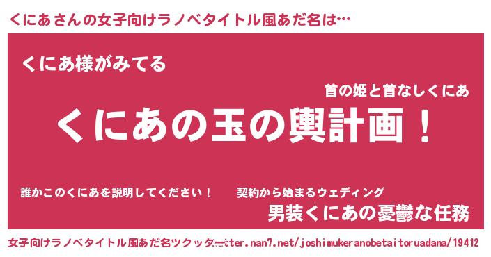 | 男性向けラノベタイトル風あだ名 | 『くにあ~年齢イコール彼女いない歴の魔法使い~』 |