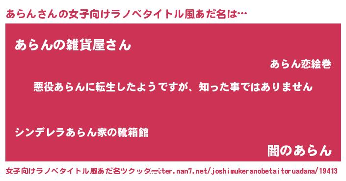 | 男性向けラノベタイトル風あだ名 | 『この素晴らしい世界にあらんを!』 |