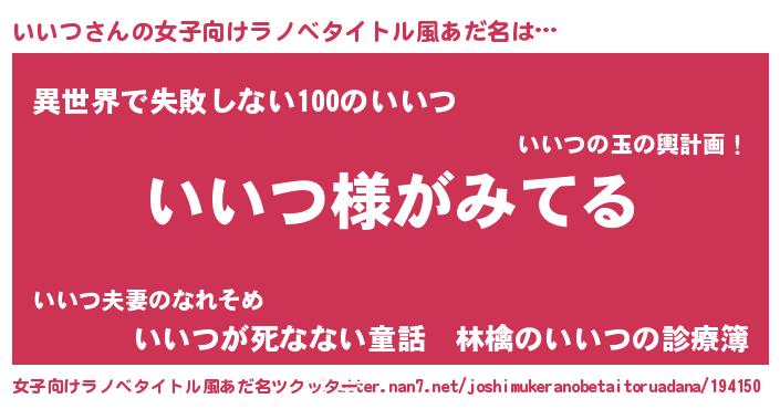 | 男性向けラノベタイトル風あだ名 | 『いいつの嫁は女の子じゃないと思った?』 |