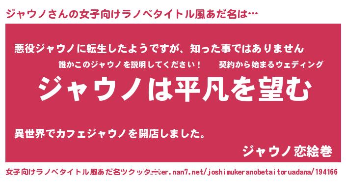 | 男性向けラノベタイトル風あだ名 | 『ダンジョンにジャウノを求めるのは間違っているだろうか』 |