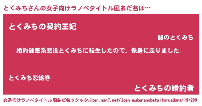 とくみちさんの女子向けラノベタイトル風あだ名は… 『婚約破棄系悪役とくみちに転生したので、保身に走りました。』『とくみちの契約王妃』『とくみちの婚約者』 ツクッター #女子向けラノベタイトル風あだ名ツクッター http://tkutter.nan7.net/joshimukeranobetaitoruadana/194209/