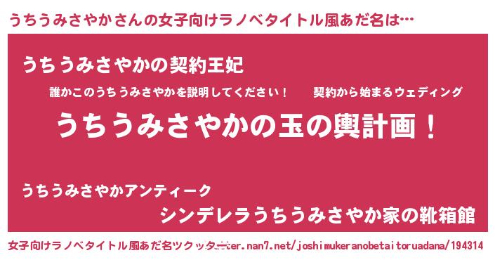 | 男性向けラノベタイトル風あだ名 | 『うちうみさやか~年齢イコール彼女いない歴の魔法使い~』 |