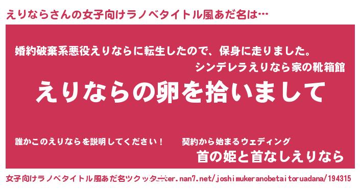 | 男性向けラノベタイトル風あだ名 | 『えりならの嫁は女の子じゃないと思った?』 |