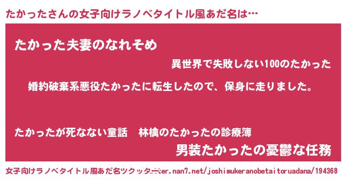 | 男性向けラノベタイトル風あだ名 | 『タカッタスレイヤー』 |