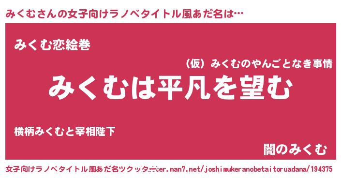 | 男性向けラノベタイトル風あだ名 | 『ダンジョンにみくむを求めるのは間違っているだろうか』 |