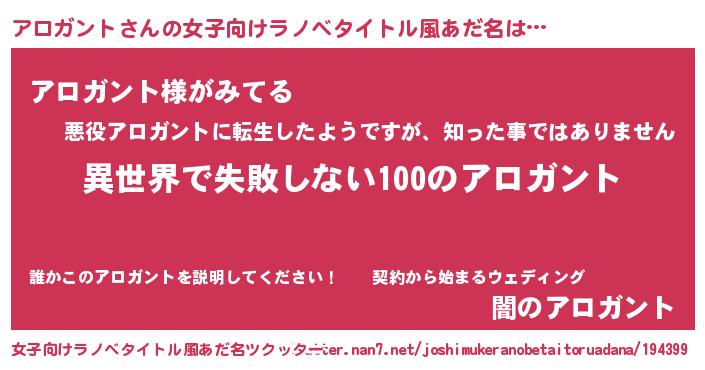 | 男性向けラノベタイトル風あだ名 | 『アロガントという概念が存在しない退屈な世界 』 |