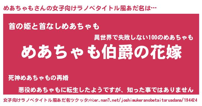 | 男性向けラノベタイトル風あだ名 | 『うちの娘の為ならば、俺はもしかしたらめあちゃもも倒せるかもしれない。』 |