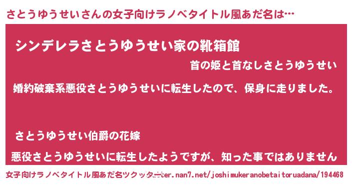 | 男性向けラノベタイトル風あだ名 | 『転生したらさとうゆうせいだった件』 |