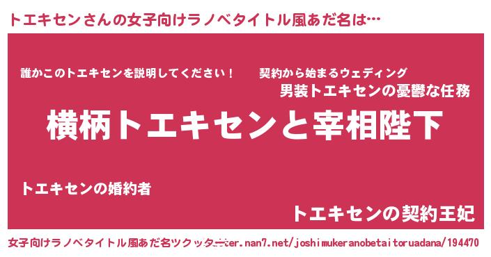 | 男性向けラノベタイトル風あだ名 | 『トエキセンに滅ぼされるだけの簡単なお仕事です』 |