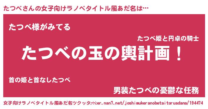 たつべさんの女子向けラノベタイトル風あだ名は… 『たつべの玉の輿計画!』『たつべ様がみてる』『男装たつべの憂鬱な任務』 ツクッター #女子向けラノベタイトル風あだ名ツクッター http://tkutter.nan7.net/joshimukeranobetaitoruadana/194474/