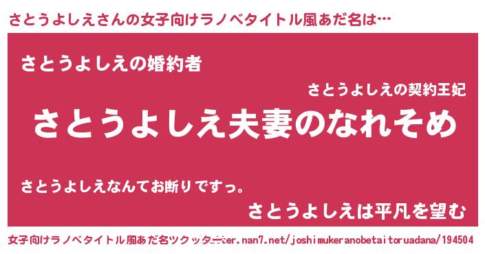 | 男性向けラノベタイトル風あだ名 | 『おまえをオタクにしてやるから、俺をさとうよしえにしてくれ! 』 |