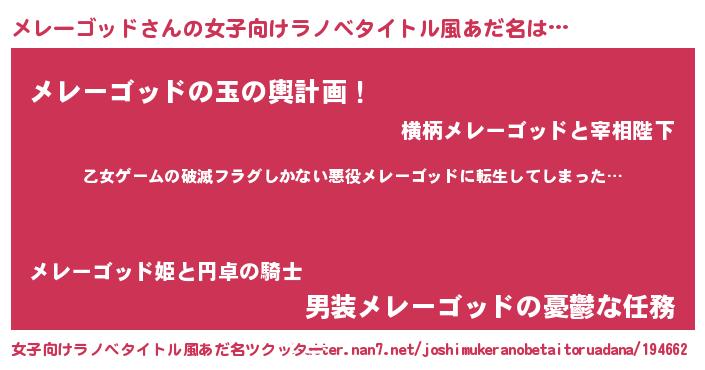| 男性向けラノベタイトル風あだ名 | 『魔弾の王とメレーゴッド』 |
