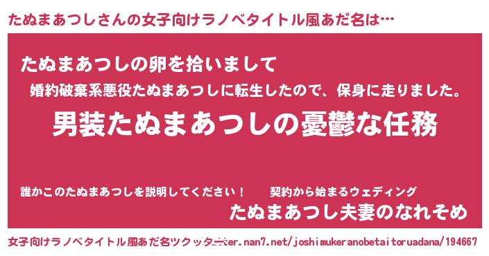 | 男性向けラノベタイトル風あだ名 | 『うちのたぬまあつしが世界を掌握している!』 |