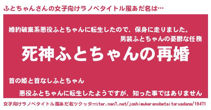 | 男性向けラノベタイトル風あだ名 | 『ノーゲーム・ノーフトチャン』 |