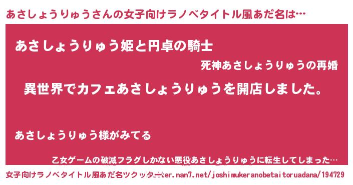 | 男性向けラノベタイトル風あだ名 | 『誰もが恐れるあのあさしょうりゅうが、ぼくの専属メイドになるようです。』 |