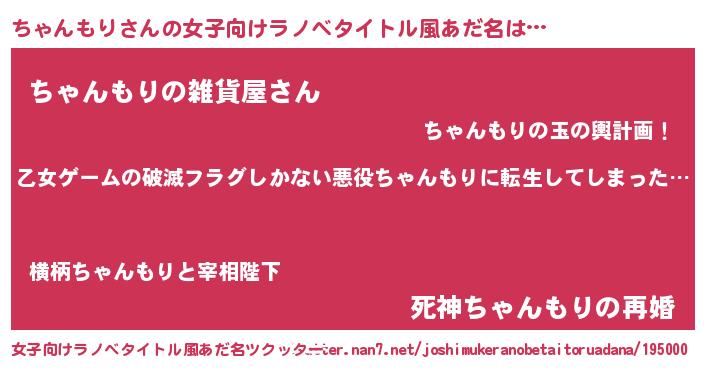 | 男性向けラノベタイトル風あだ名 | 『この素晴らしい世界にちゃんもりを!』 |