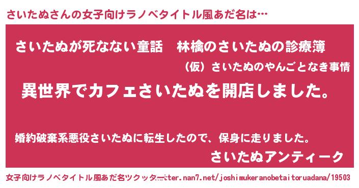| 意味不明あだ名 | 『永久保存さいたぬ』『自称さいたぬ』 |