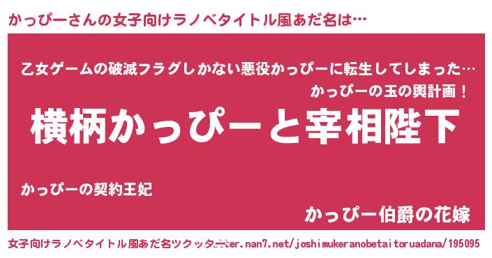 | 男性向けラノベタイトル風あだ名 | 『かっぴーに滅ぼされるだけの簡単なお仕事です』 |